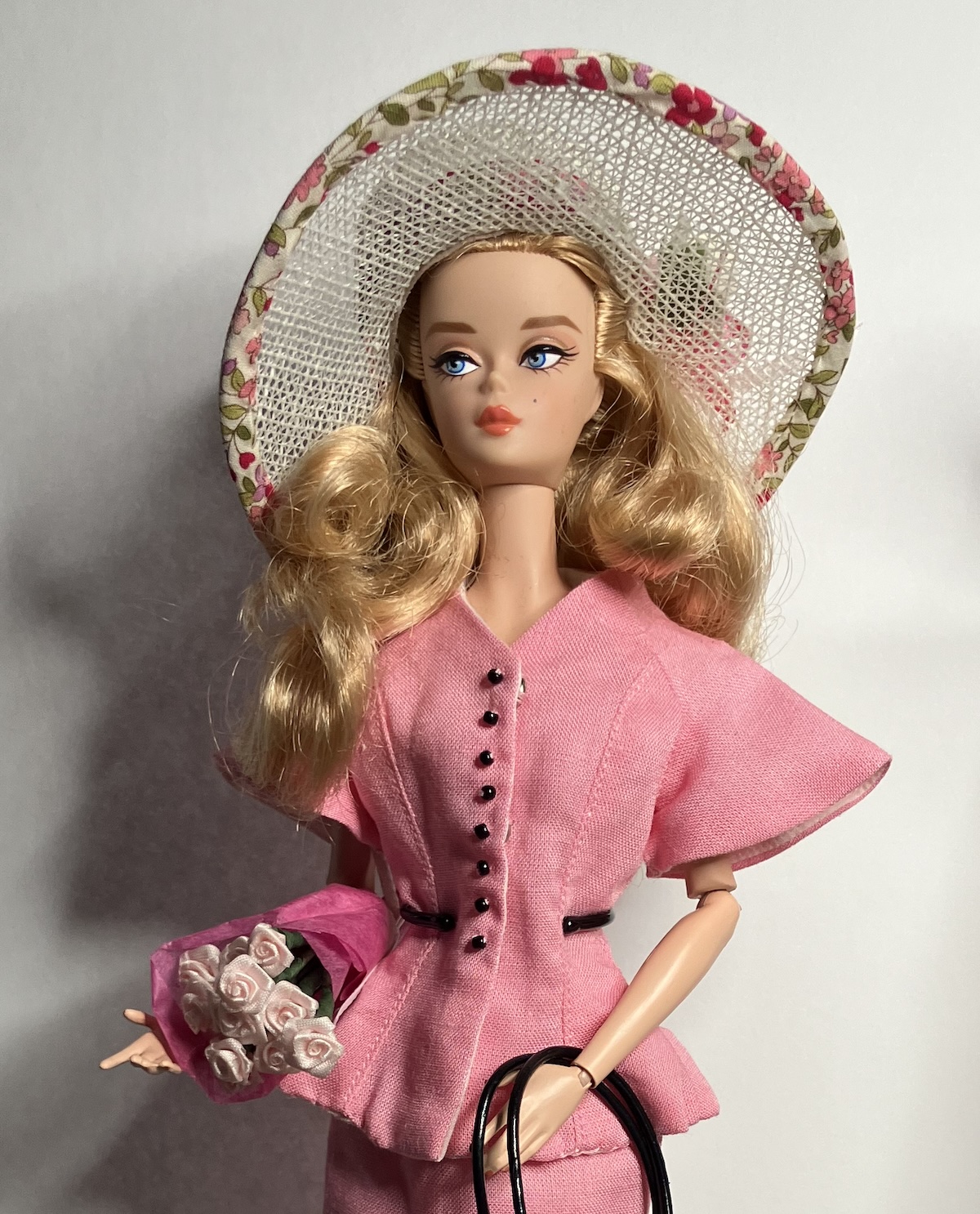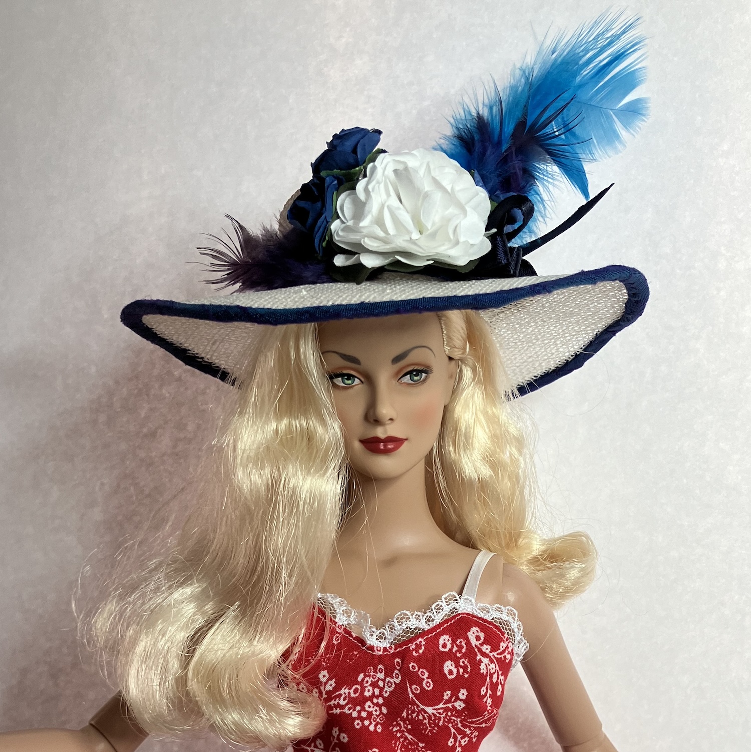Finally, I made a hat for the 11.5″ girls with a curved crown. This was supposed to be a pillbox hat, inspired by the book, but I watched Four Weddings & a Funeral again and had to add the big brim instead.