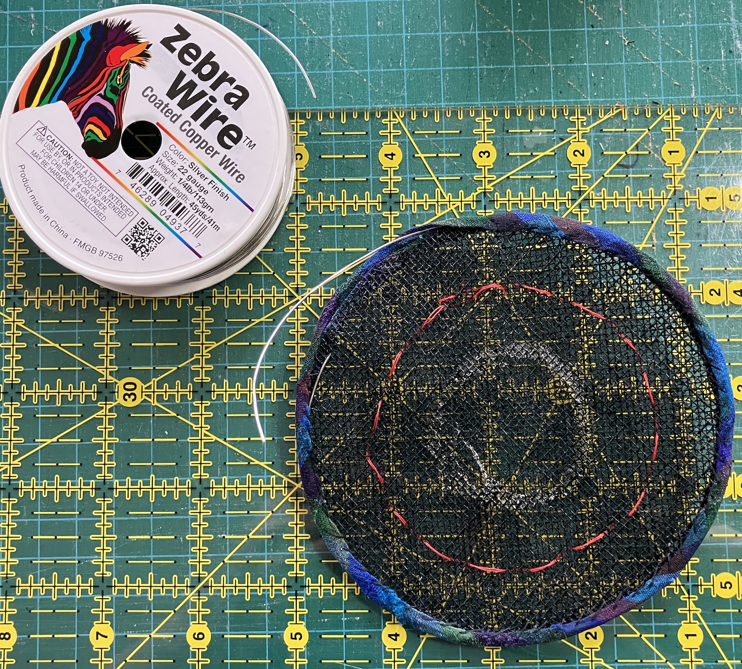 I put a wire in the brim of several of the hats in this round of hatmaking, sewing it under the bias trim on the outer edge. This is a 22 gauge wire, a fairly stiff one, which seems about right.