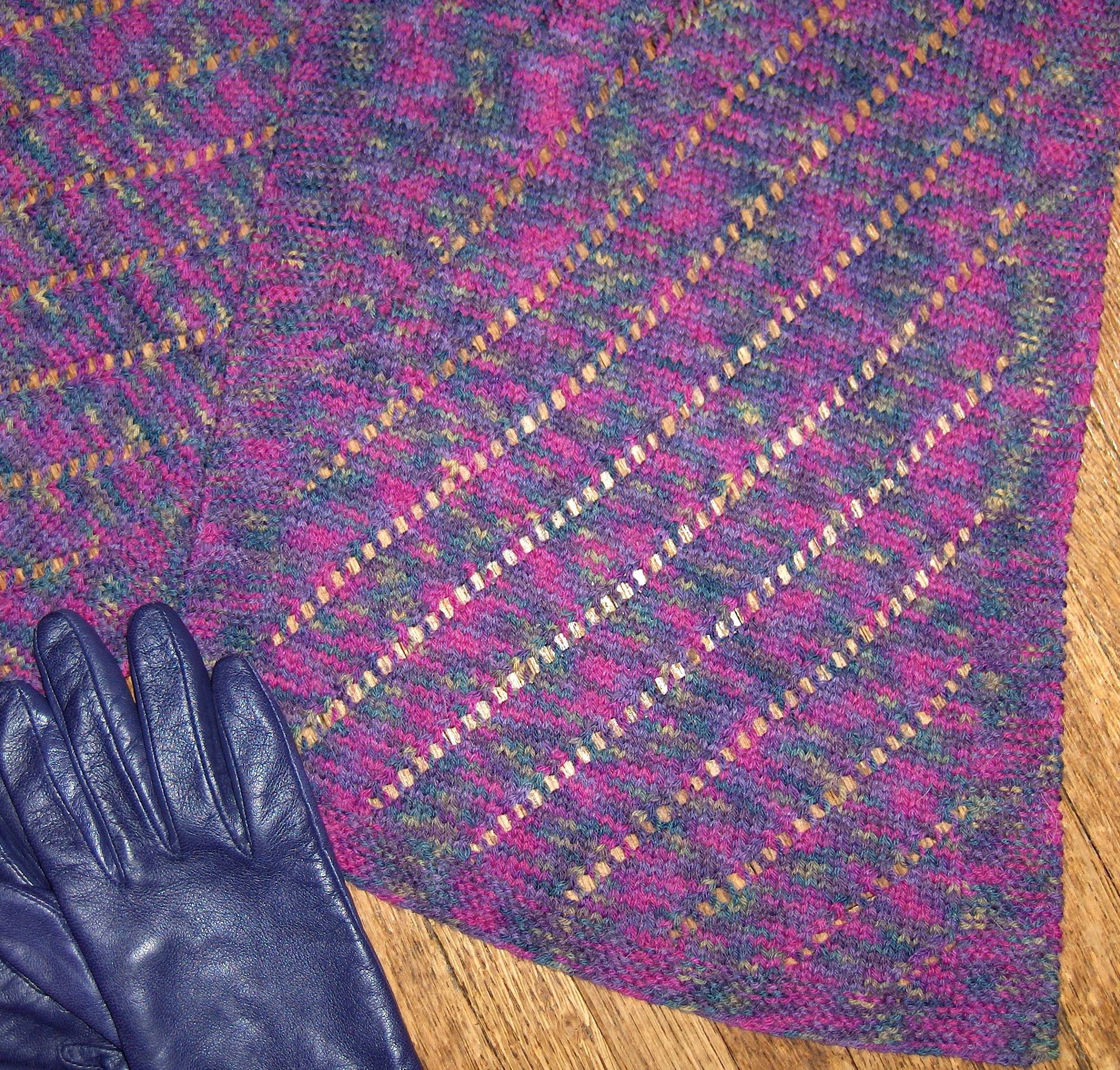 Just for fun, you could knit the garter stitch borders in another colour. Cast on with your border colour, knit the first 8 rows, then on the first row of the pattern, use that thread for the first K8. Join the yarn you’re using for the pattern stitch, then join another ball of the border colour for that last K8. Knit the length, then bind off both the colour for the pattern and one of the balls of border colour before knitting the last border with the last border colour ball. Easy. It would look really striking to border a hand-painted yarn with a coordinating solid.