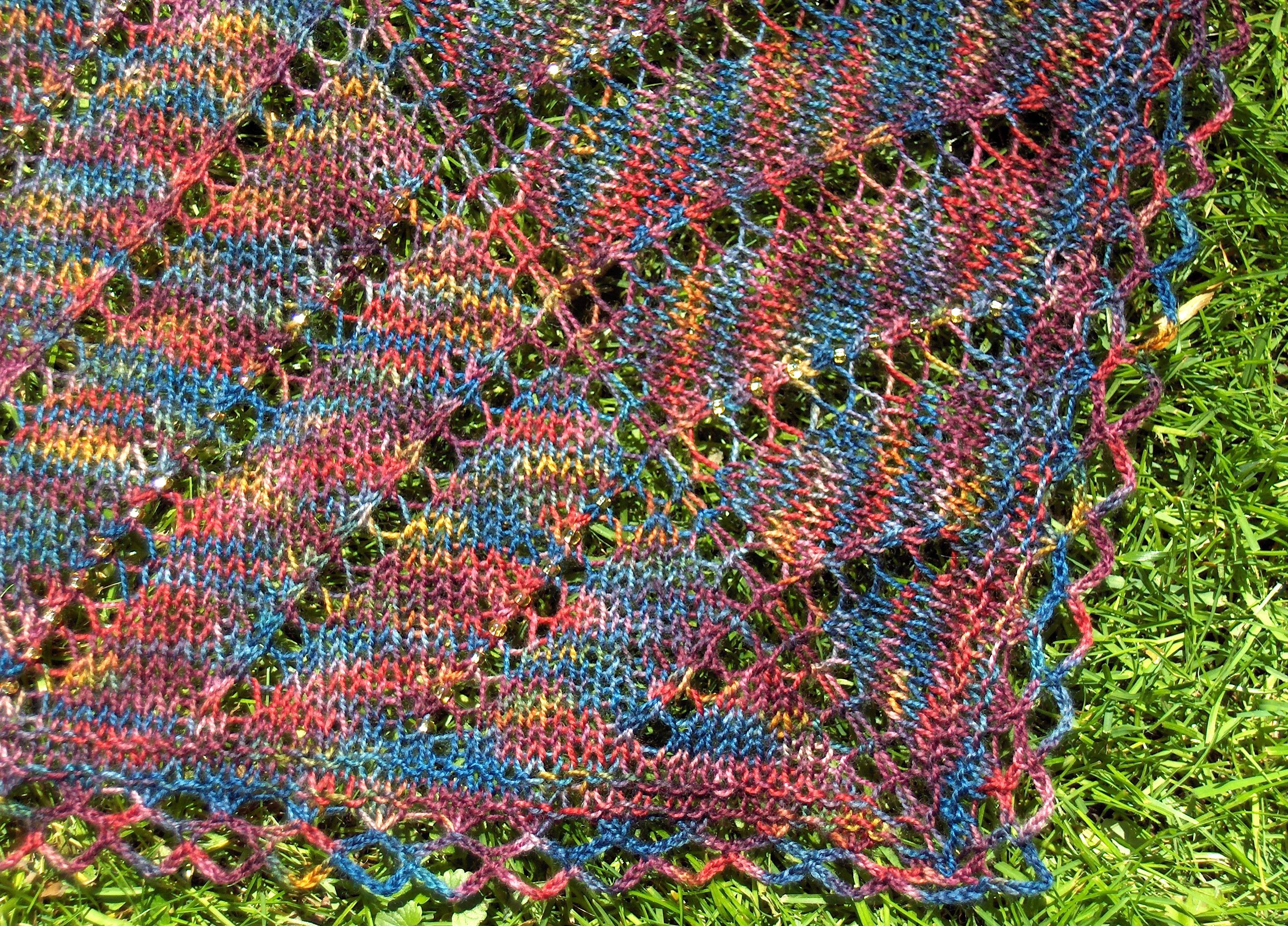 Essentially, I knit until the yarn was almost gone (the skein was about 400m) then did a quickie edging. Theoretically, these are half circle shawls – well, half hexagon – but in reality, they always want to block to be more than half of a circle. This is a nice size, though – it hangs just to the elbows.