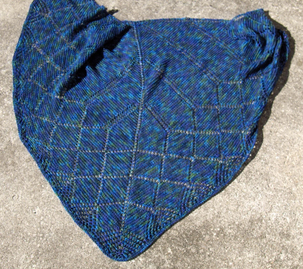 Things didn’t go any further until I wore it – and someone asked me about the pattern. Oh. I couldn’t find my notes – at least none that were very coherent – so I sat down with graph paper to reverse-engineer the pattern. It was easier to make it up as I went than to figure out later what I’d done! Needless to say, I wasn’t enormously confident in my instructions. I hit the stash, found this blue sock yarn, and knit the shawl again, following my instructions.