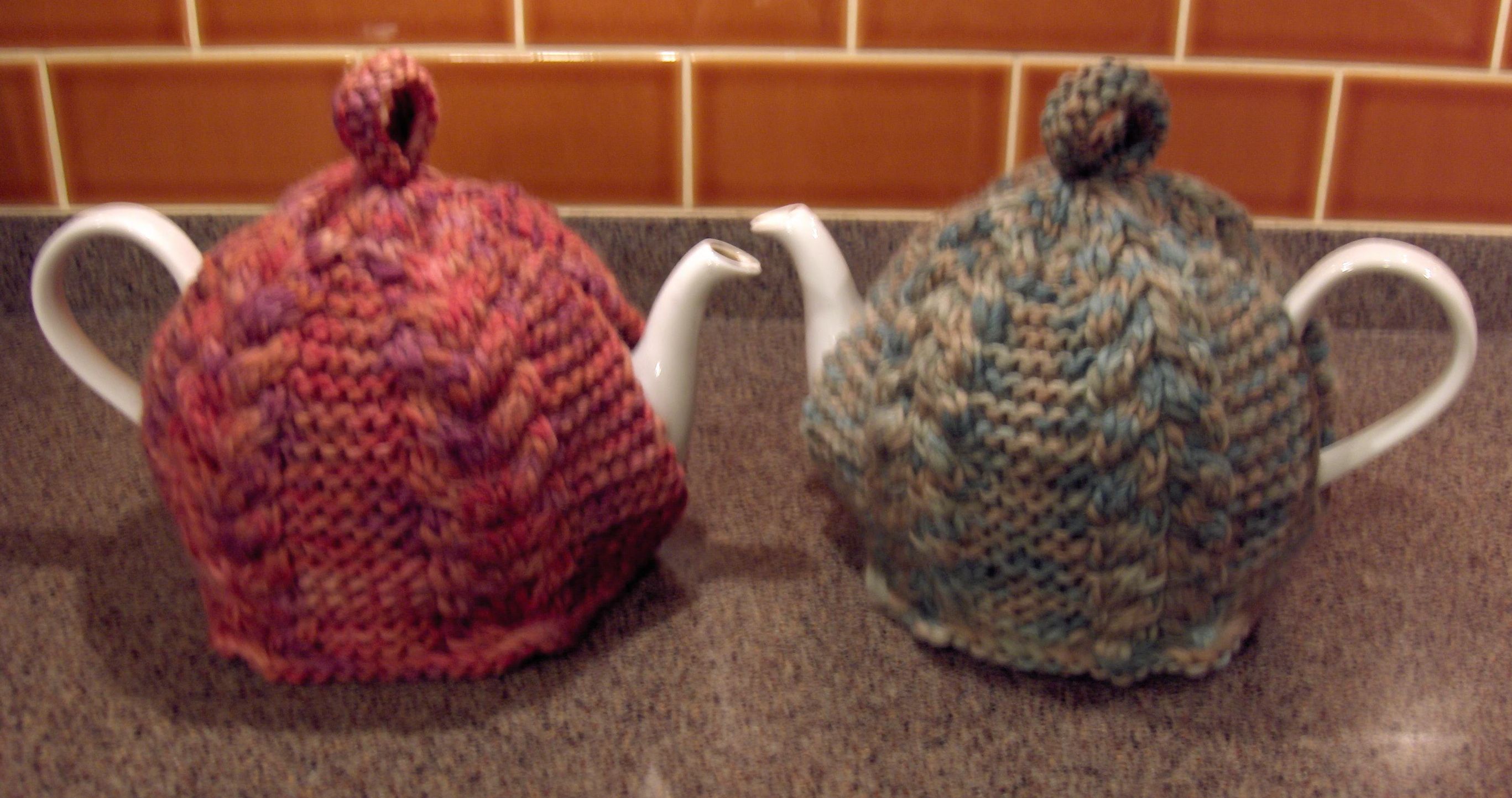 The idea was that the green one would be a gift, but as you can see, I have two teapots and it wasn’t long before it was put to work right here. (You might also notice that the cables are done differently on the two cozies. The green one has cables the way they’re supposed to be. It doesn’t make a huge amount of difference, but the top is slightly easier to work when the cables twist the right way.)