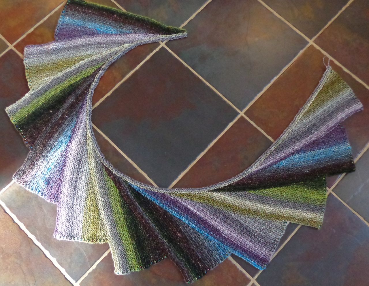 I had enough yarn to do ten triangles this time. And I figured out what I’d done wrong the last time – the pattern says to Slip 1, Knit 2 before placing the traveling marker after each work and turn. I only saw the K2, so my W&T’s on the first shawl are two stitches apart. They should be three stitches apart, as they are here. Doing it the other way made each triangle wider, but also made the shawl wider. This version is more like a scarf.