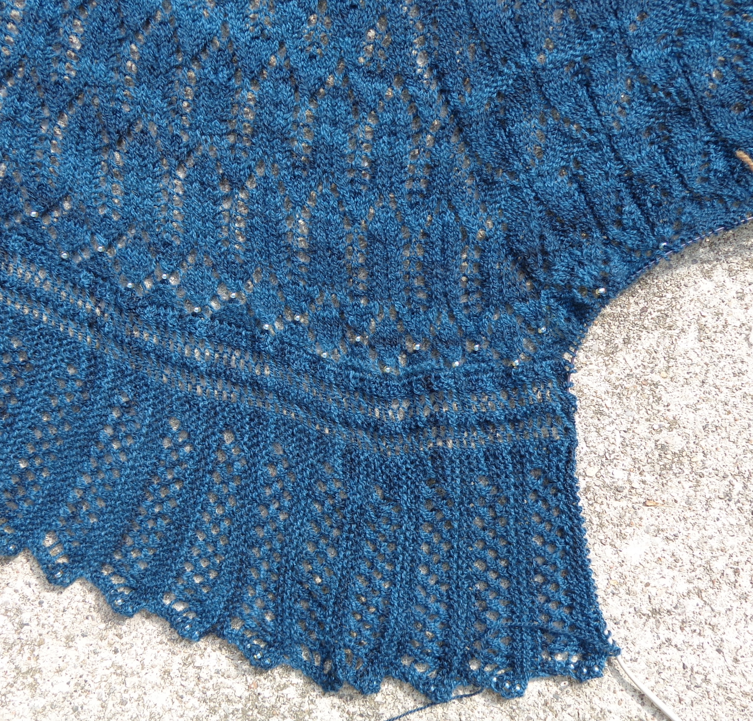 This is a Faroese shawl, which means it has a distinctive shape. A Faroese shawl has a vertical band down the centre back – you can see it still scrunched on the needles here – then each side extends like a wing. The border along the hem is knitted on last, which is what I’m in the middle of doing right now. Even though the shawl isn’t blocked, you can already see the shape of it, at least on this left side. The shape is even more clear in the shot on Anne’s website, because that shawl is finished and blocked. (Here’s the link again.)