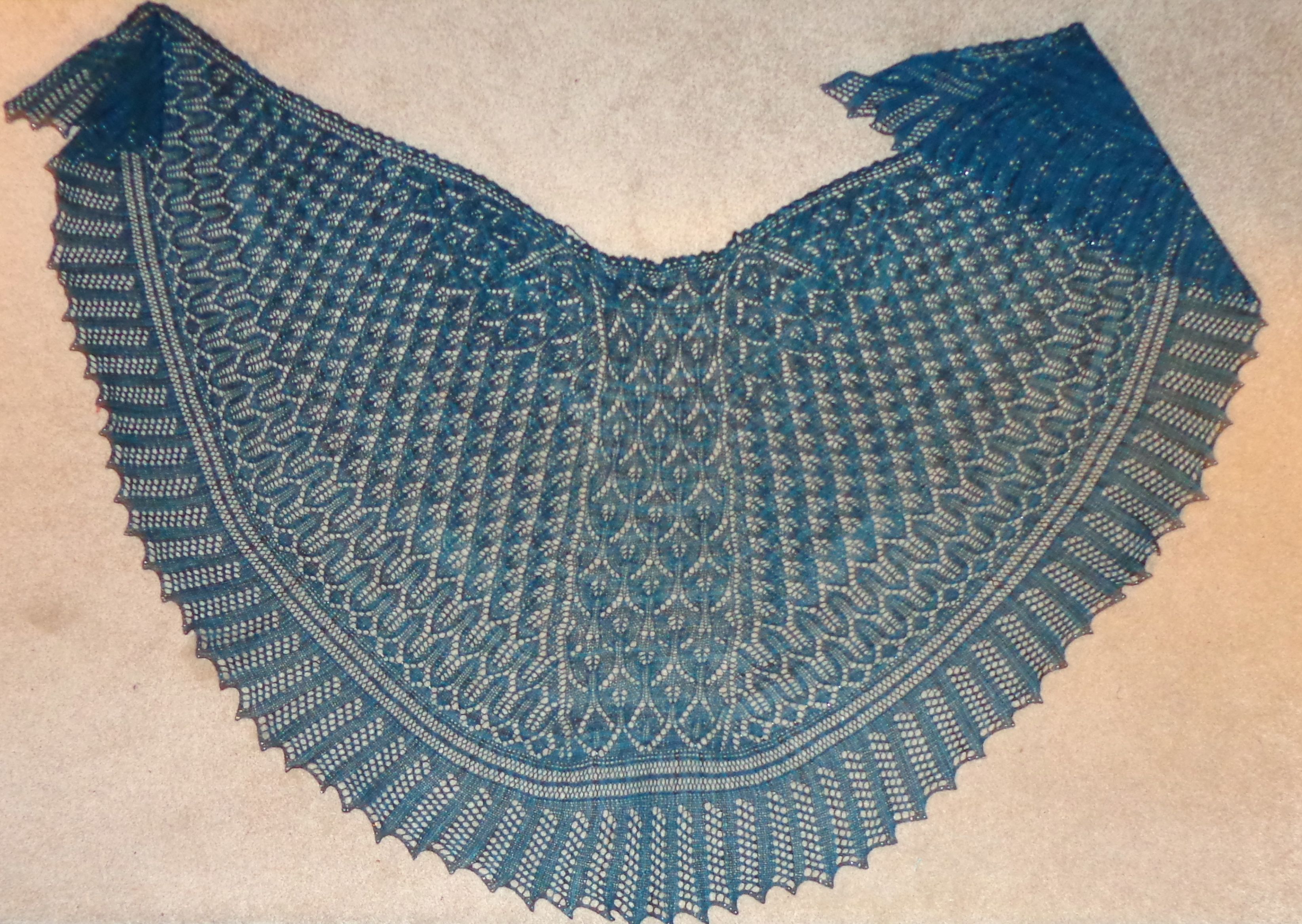 And here’s the finished shawl. It’s HUGE! 36″ from the centre back neck in all directions.