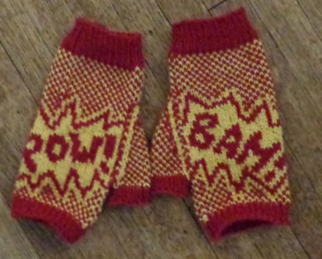 The pattern for these fingerless gloves is Fightin’ Words (that’s a Ravelry link) and I knit them in Knitpicks Palette. (Every time I look at this yarn on the KP site, I’m tempted by their Palette Sampler, which includes one ball each of 150 different colours. What fun!) The pattern was available at a special price for December as part of an indie-designer knit-a-long.