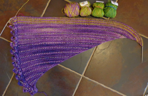 You can’t see another change I’ve made: on every row knitting back toward the border, the first stitch is to be knit according to the pattern. I thought the edge was too tight that way, so began to slip that first stitch instead. (And actually you can see it if you know what you’re looking for. The shawl begins at that lower point, where the purple end of yarn is showing. You can see that the right edge curls more in those first few rows – I changed to slipping the stitch before that row of 5 beads.)