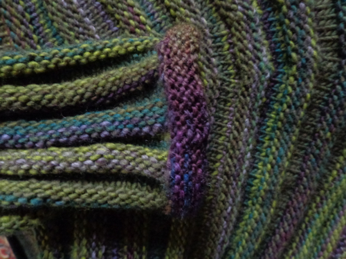 It’s knit in Berroco Jasper in a variegated green (Jasper has been discontinued so this link will show you the yarn but not the colours), with some variegated purple mohair (Mountain Colors Mountain Goat) along the outer edge. The green has purple in it and the purple has green in it, which works for me. Here’s a detail of the cuff on the sweater. Tangerine Rose by Sandra McIver