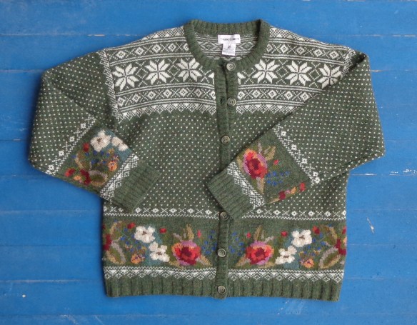 I found this sweater at the thrift store for a couple of bucks. It has a floral border around the hem – which matches at the side seams and must have been handknit – then a Scandinavian-style top. (You know that the white flicks in that stitch pattern are called “lice”, right?) It’s 100% wool and in good shape (no moth holes). It was made in Hong Kong and was sewn for the finishing – the button bands are sewn on and the button holes were worked by machine. So, it’s partly machine made, but very pretty IMO: