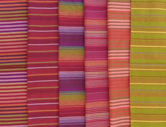 The third one from the right isn’t pink at all, even though it looks that way in the photograph. I have more striped fabric but wanted to focus on that brick red and the olive green.