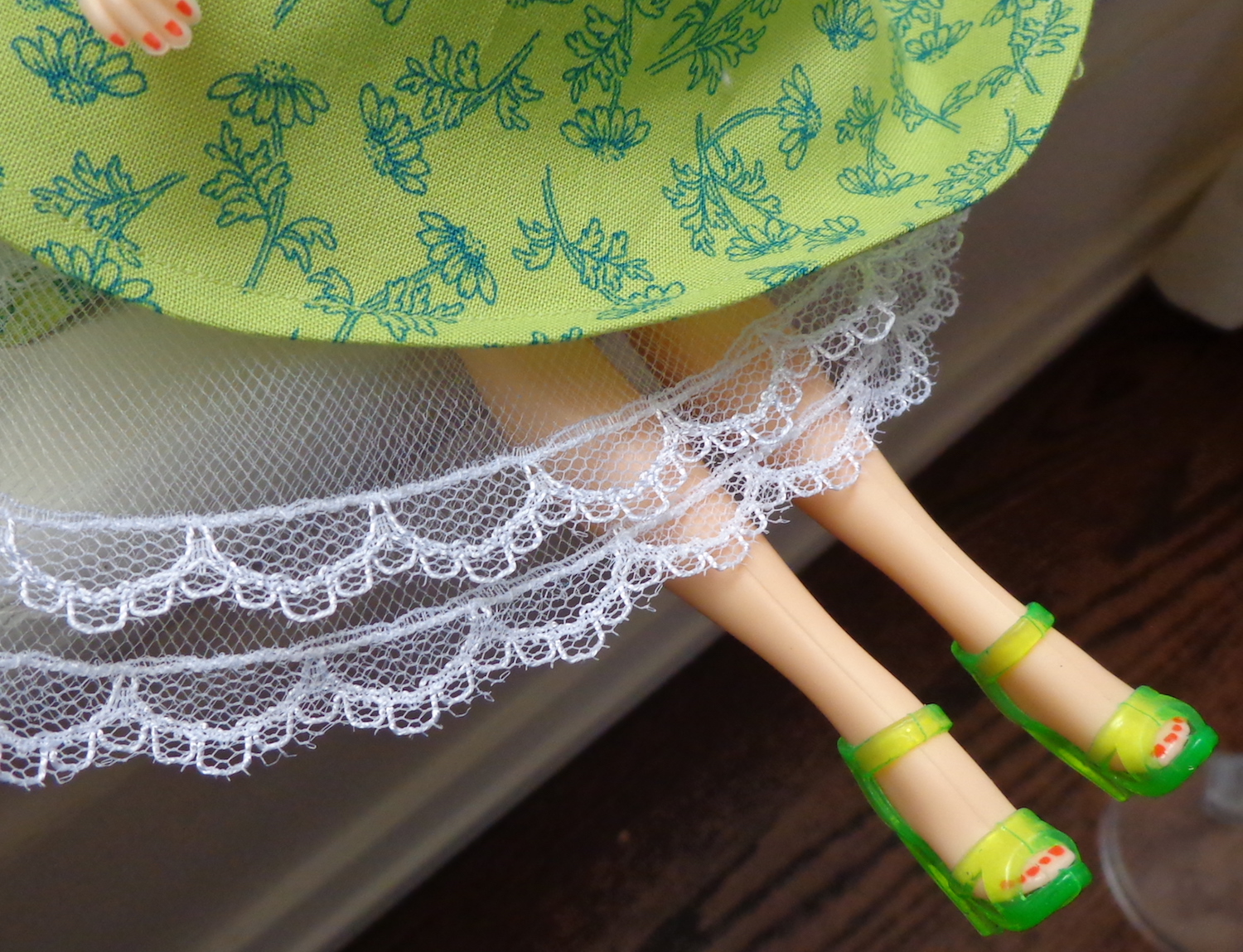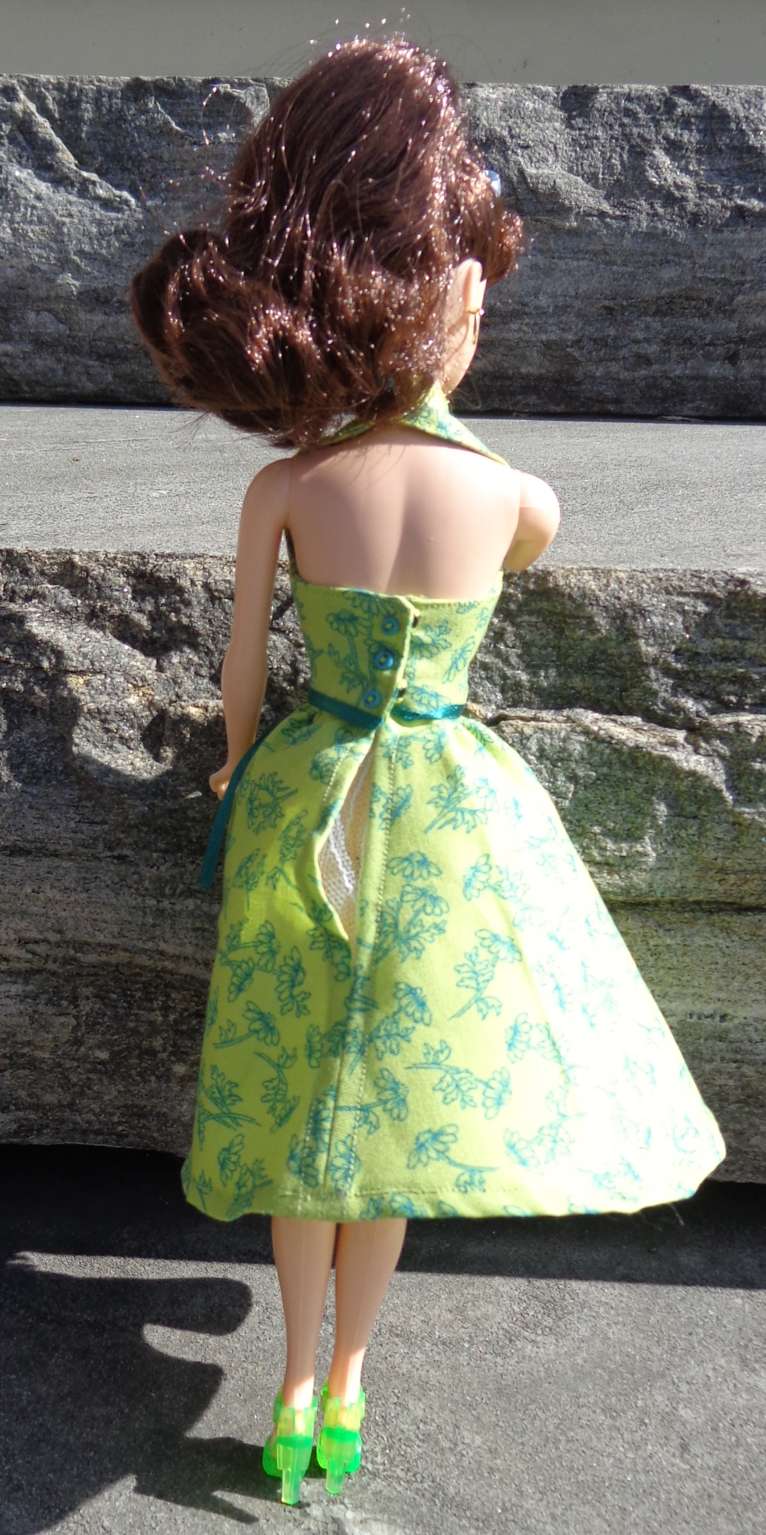 I liked the vintage look of these garments for Barbie and made the sundress shown in blue and white on the pattern envelope. It’s a halter back dress with a full circle skirt and is Dress E.