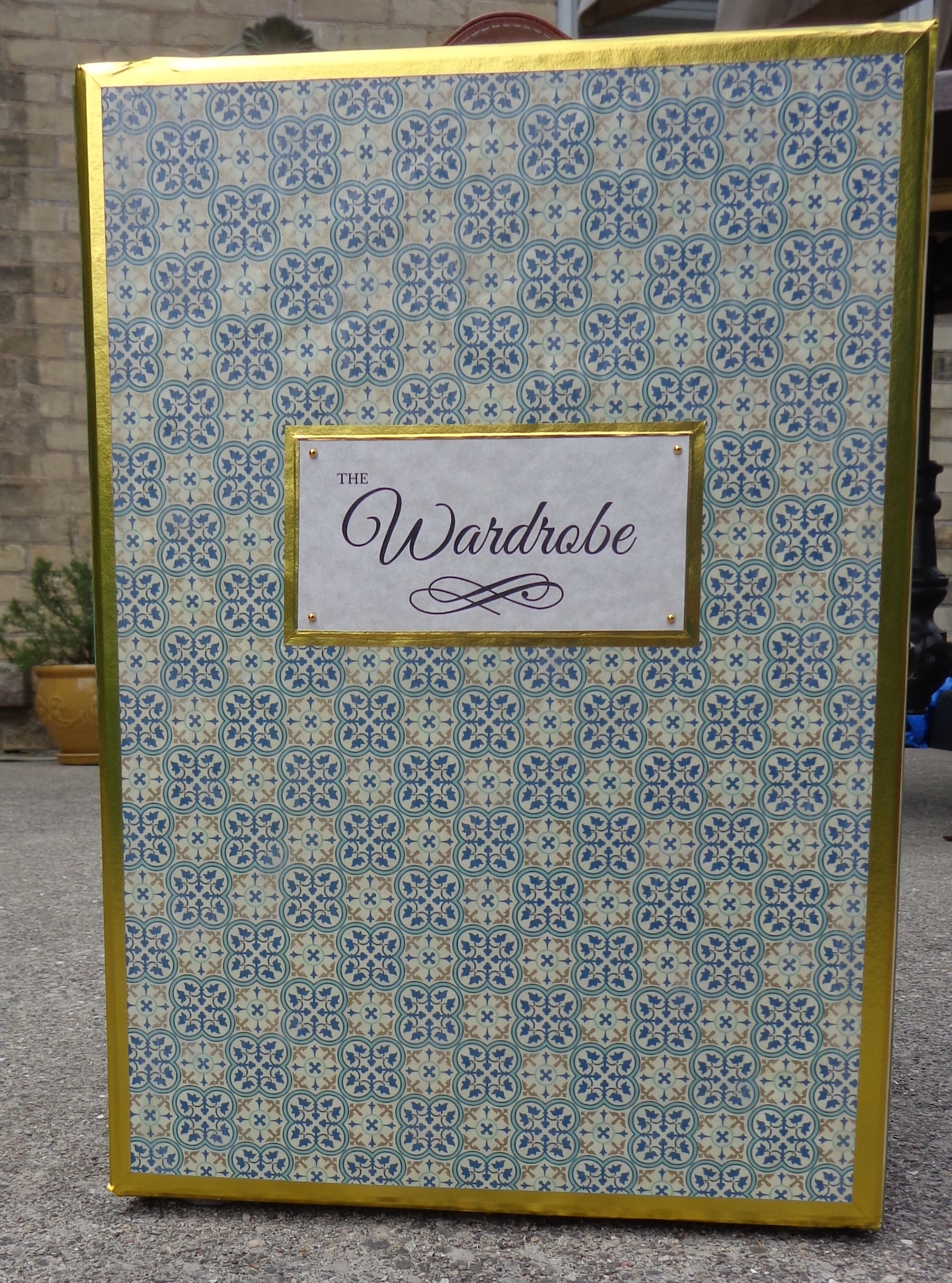I put felt pads on the bottom of the box for feet, as well. In this shot, you can see the two metal rivets from the second handle. I couldn’t get them out, but they’re shorter than the felt pads so all is good. I put felt pads on the lid, too, so the wardrobe isn’t tippity when it’s open.