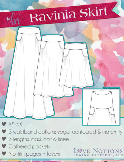 The Ravinia Skirt can be cut in multiple lengths, has a full swingy skirt, a contour waistband that sits below the waist (a fave style of mine) and – pockets!