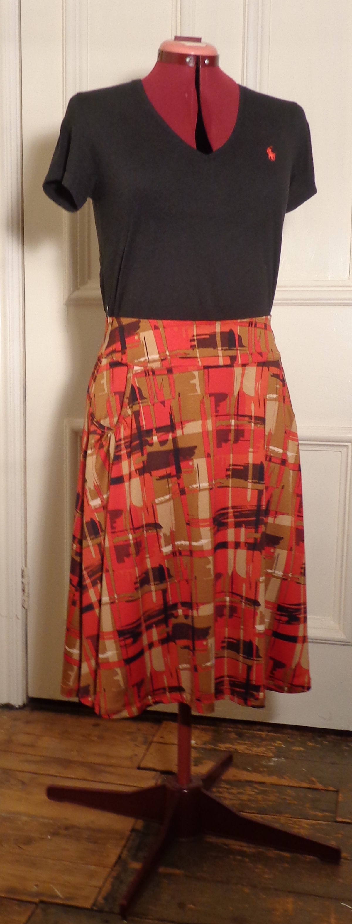 The first version I sewed was in a knit remnant with a red graphic design. I thought I had enough for the shortest version—I’m glad I checked the length before cutting, though. I prefer skirts to be just below the knee and the shortest (“knee length”) would have been above my knees. I’m 5’5″ so it’s not because I’m tall. I added four inches to the skirt length and the finished skirt is just below my knees. I put one pocket piece in backwards by mistake—the wrong side is showing instead of the right, but it’s the pocket facing against the skirt front, so no biggie. I followed the directions to zigzag a length of elastic around the top of the waistband and really disliked how it looked and fit. I ripped it out. As a result, the skirt fits but the waistband is really loose – if I lose 5 lbs, it’ll fall right off. This one isn’t a keeper, but it was a test sew.