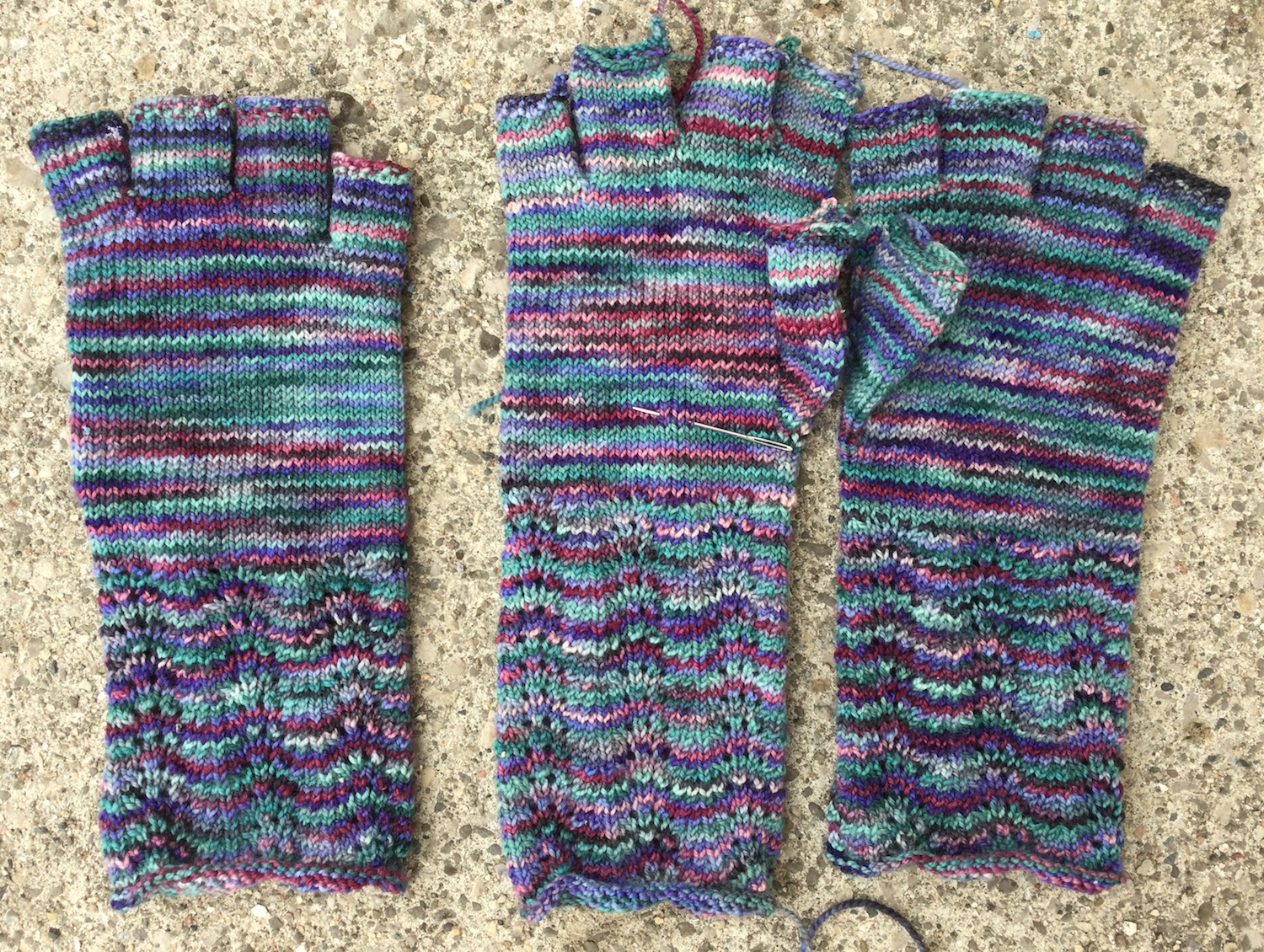 Instead of using a second skein, I went back and cast on the second of the shorter gloves from the leftovers of the first skein, to make sure it matched. Koigu comes in skeins of 50g and the first short glove used 28g. For the second glove, I got all of it out of the remainder of the skein except the fingers – if there’s a colour difference, you can’t see it.