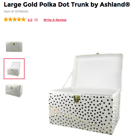 The wardrobe is a chest from Michaels, which is standing on one side. (It’s the Large Gold Polka Dot Trunk from Ashland. That’s a Michaels Canada link, which will probably go 404 once they’ve sold out of this box, so I’ve included a screen shot of it here.) It has rope handles that knot inside – easy-peasy, I untied one and threaded it through the top eyelets to double the handle there. The eyelets on the bottom are covered by the paper lining. I put felt feet on the bottom, too.