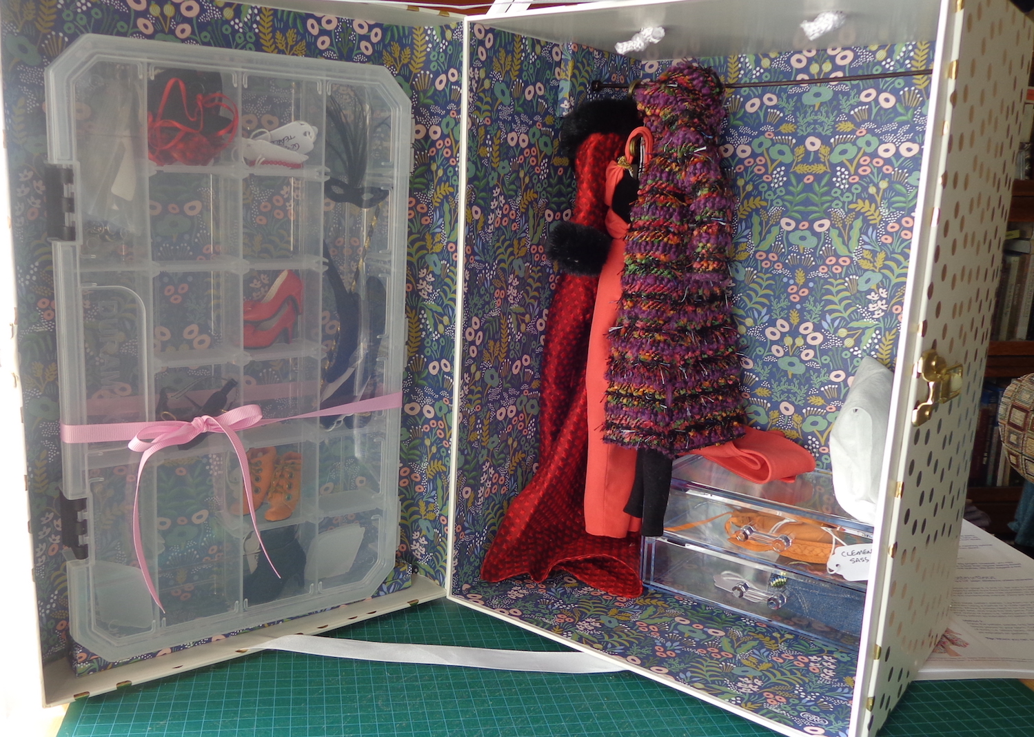 I have to replace the hanger bar in this one – I used a bamboo skewer (painted with marker) just the way I did with the Barbie wardrobe, but it’s too flimsy. I’ll replace it with a wooden dowel. Tied inside the lid (or door) is an organizer from the dollar store which is perfect for shoes etc. The dividers can be removed when I need a larger space. I thought of gluing it in, but Mr. Math was skeptical that any glue would hold that hard plastic, especially with a lot of opening and closing. I glued in the ribbon instead, then covered a little block at the bottom in the interior wallpaper. That raises the organizer so the lid/door of the case closes more easily. This solution works very well.