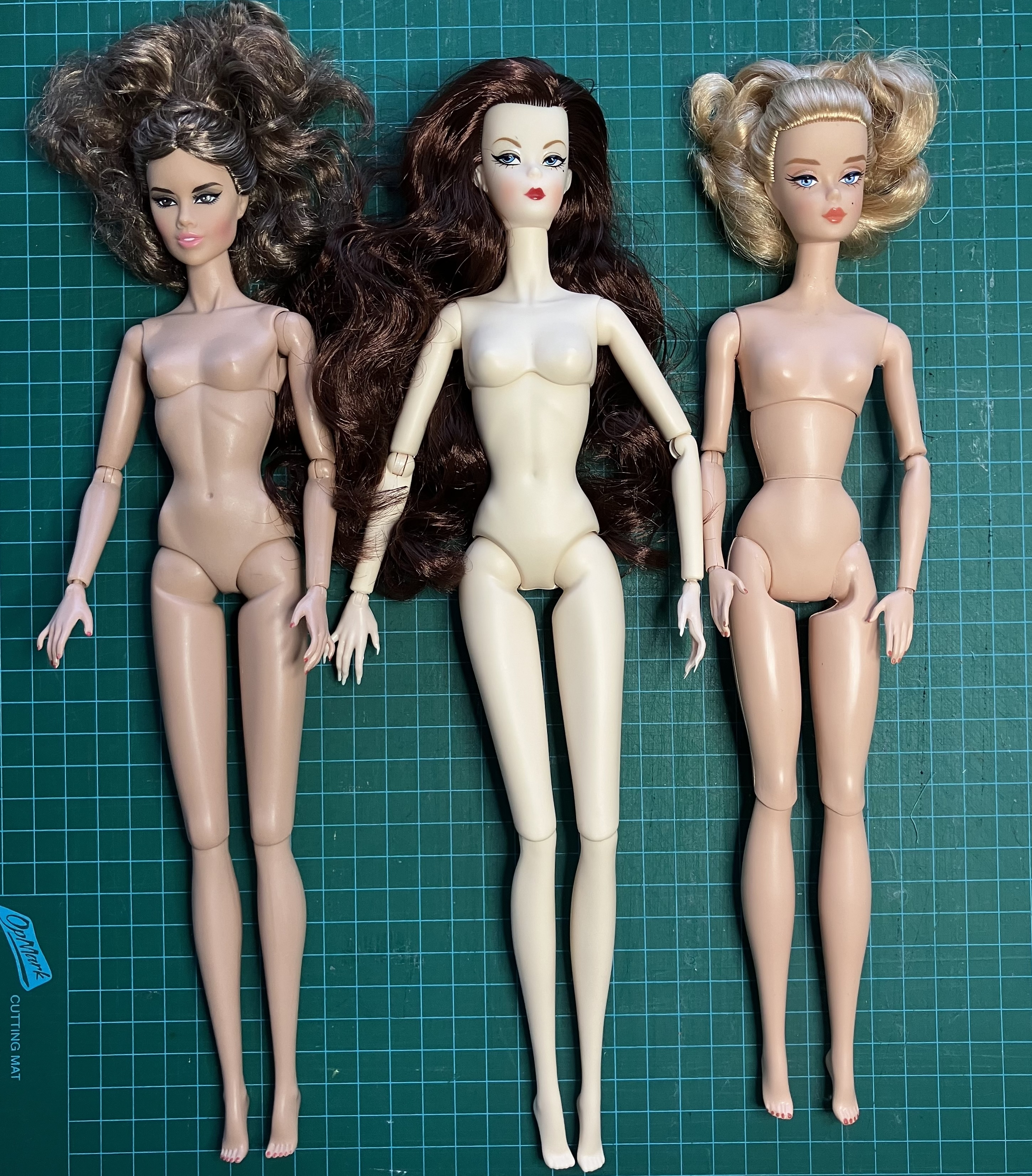 When she arrived, I compared her with two of my other dolls. On the left is Jade from Integrity Toys/Fashion Royalty. The body of the new one (in the middle) is most similar to this body type, although she’s a bit taller and has a longer neck, too. She’s also much lighter, so a different plastic has been used for the body. On the right is a Silkstone Barbie, Best in Black, who is a good bit shorter but also an articulated doll.