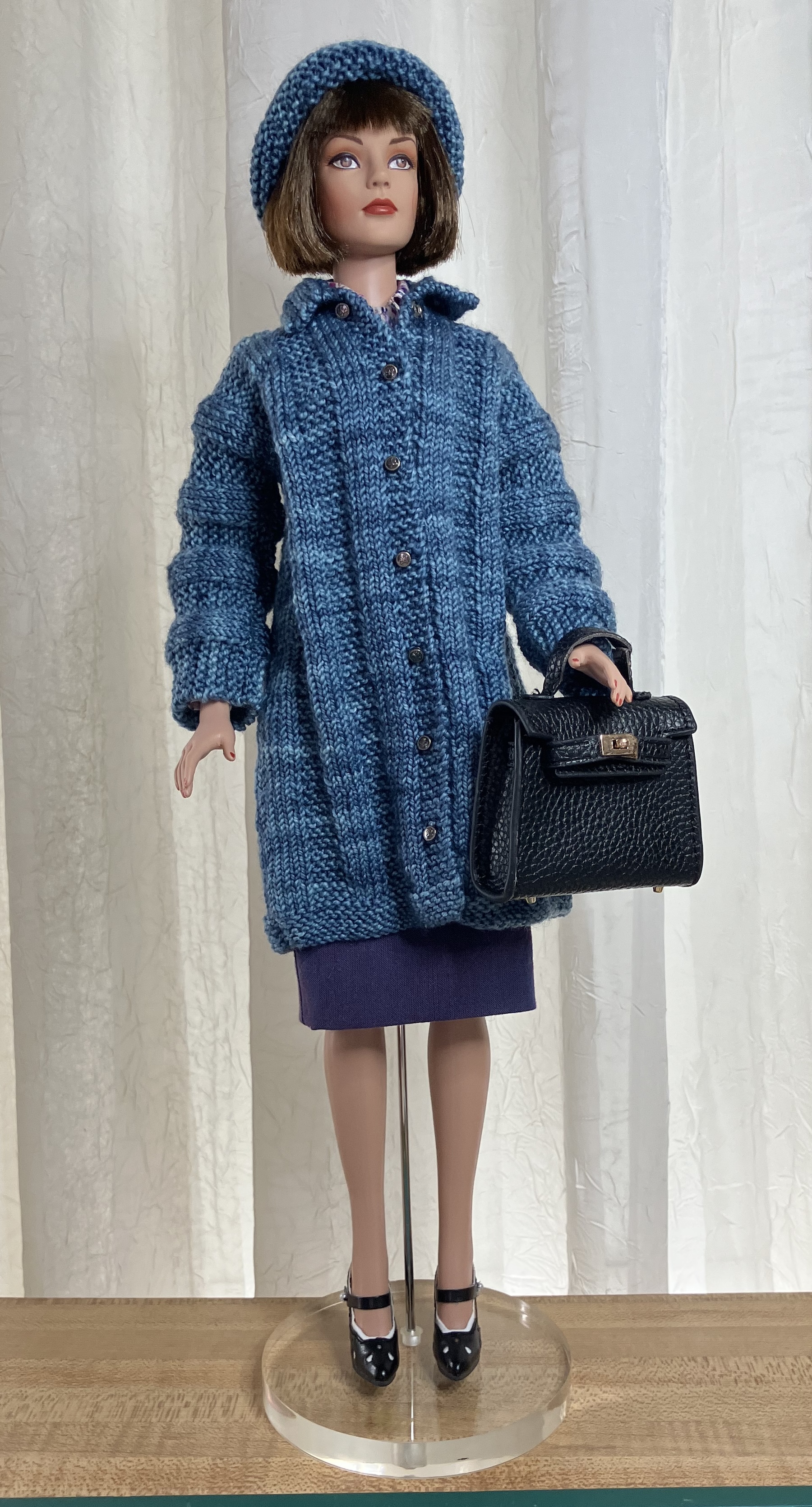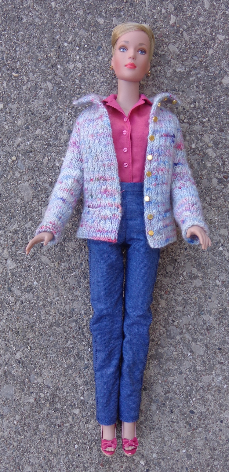 I also made Sydney a blouse and skirt to wear with this knitted coat. She looks like a librarian to me in this combo, thus the glasses and book.