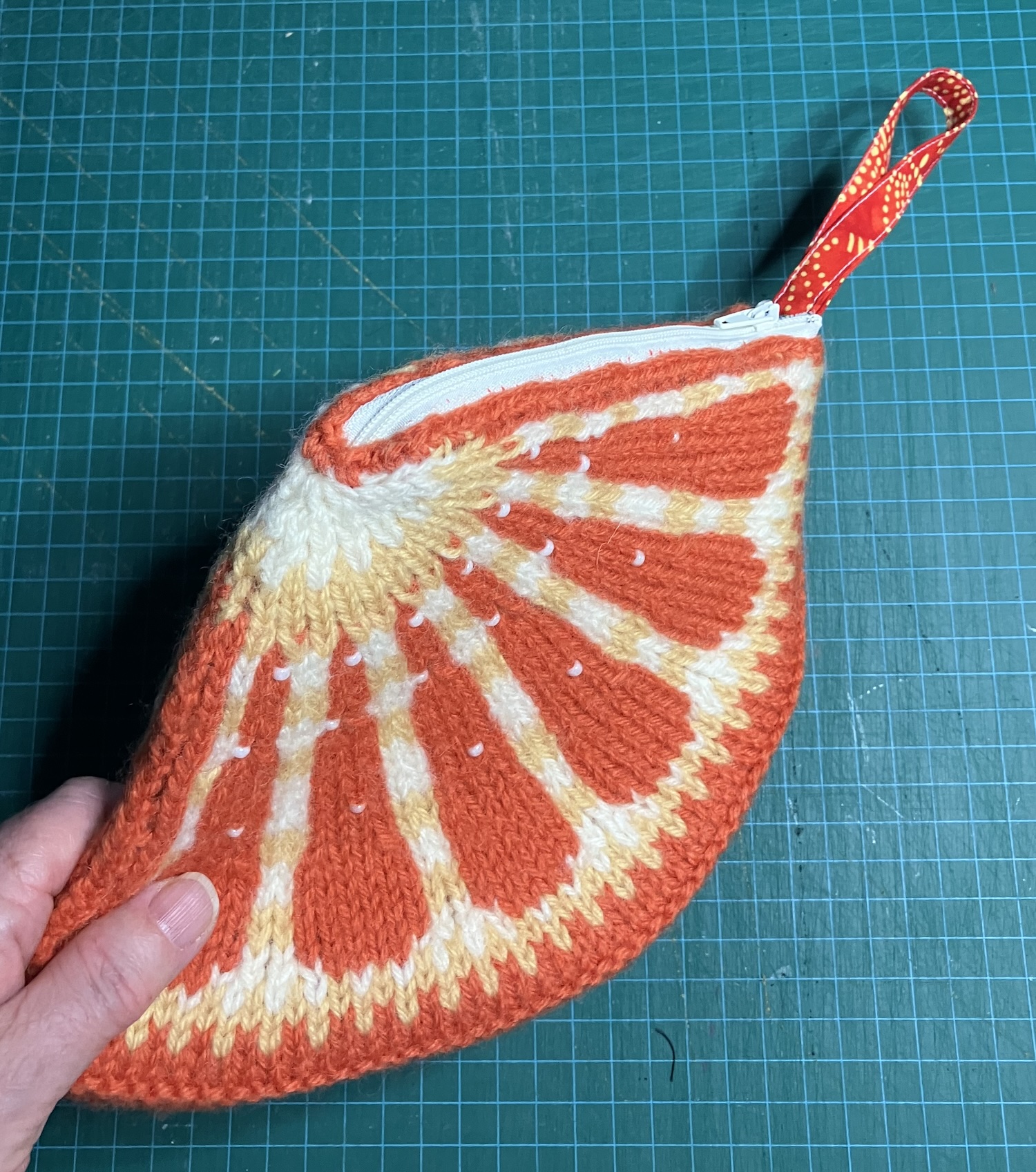 Usually, when I put a project aside, there’s a reason. I had no idea how to line the orange, given its unusual shape, plus I thought it was too floppy to make a good purse. Similarly, I liked the handle of felted leaves, but it felt too soft to be functional.