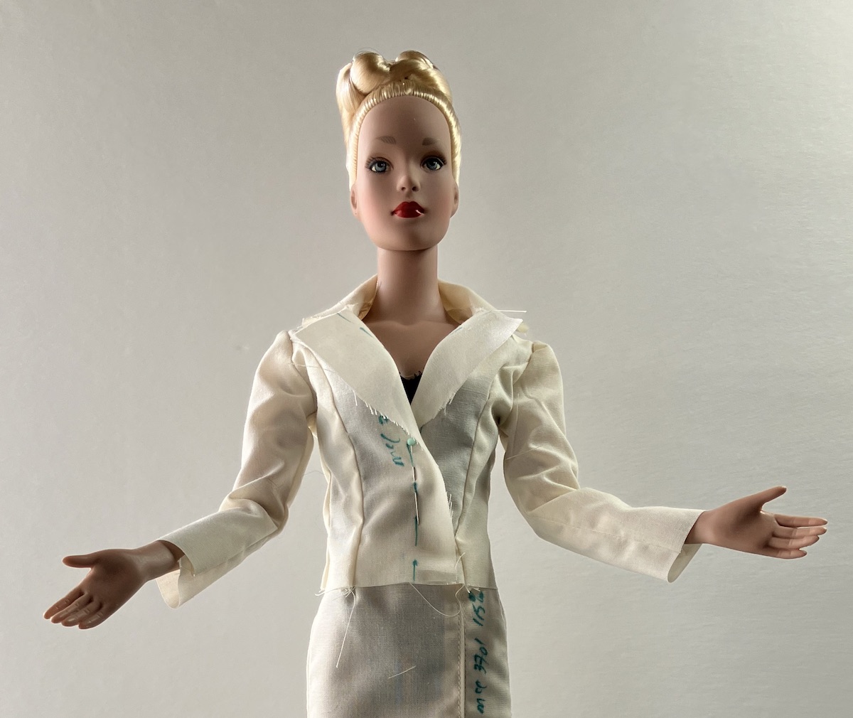 I made some modifications for the coat on the right, cut of another mystery fabric which has a perfect pattern in scale. It’s black and white, literally one thread in each color alternating, and looks like a tiny check. It wonks out my eyes a bit to topstitch on this fabric, but it looks great in scale. (I made a suit for Barbie of it, too.) I made some modifications for this coat: I lengthened the coat by 1/2″ and moved the pocket flaps down 1/2″. I also made the lapels and collar pointed instead of rounded and changed out the ruffled sleeve for a plain one.