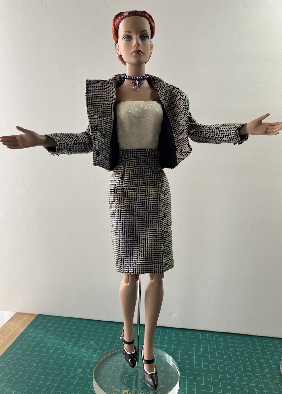 It’s funny that I chose the same black and cream check for both double-breasted suits, but I do like how it finishes out with the black buttons. Sydney also has the perfect shoes. The one for Sydney has a better back closure on the skirt, too, because I added a tab of fabric to one back piece. Hmm. Methinks Sydney needs some black stockings. All the ones I have are nude (although she’s not wearing any in these pics.)
