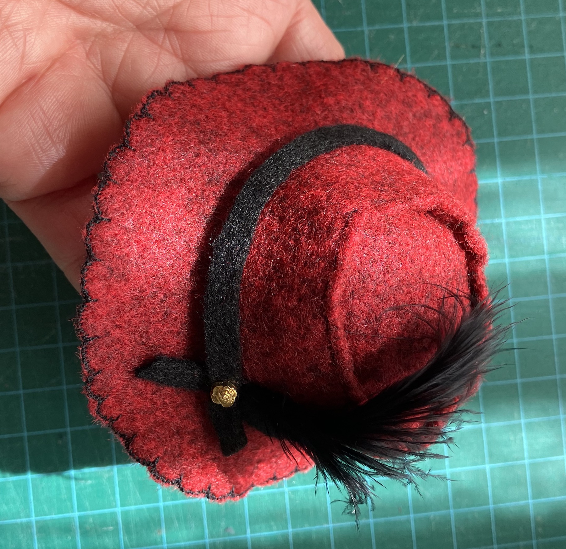 You might remember that I bought the pattern for sunhats from DBDolls last year to go with their sundresses. For this one, I played around with making the hat from felt – the pattern uses linen. This is just polyester felt but I could do it again in wool felt. I played with the depth of the crown and of the brim, as well as cutting the top as an oval instead of a circle. My big new trick is adding that pleat at the top – I turned down 3/8″ on the top edge of the piece that goes around the doll head, then hand-stitched the oval crown to it, slightly below the stitching line. That gives a nicer definition to the top of the hat, IMO. The embroidery stitch on the outer edge of the brim was an experiment and a technique I’ll use again. The feather is from a pack of zillions of different coloured craft feathers that I got for a couple of bucks at Michaels – and there’s another rose button on the band.