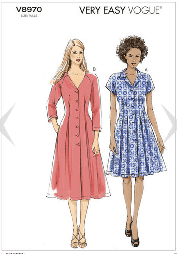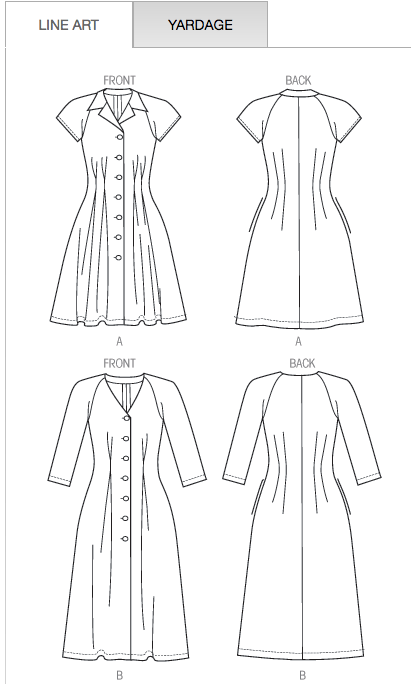 You can see that I paid the princely sum of 49 cents for it at a thrift store—it was uncut. I did make quite a few changes though and included the instruction sheet in the image so you could see what I mean. There are four views, all of which have the same back: there are two variations of the neckline and two lengths. The deeper neck has box pleats and the straighter neck has tucks.