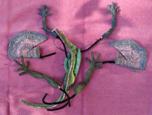 A few weeks back, I started to knit a dragon. The pattern is called Doughty Dragon and it’s knit of Noro Kureyon Sock. I happened to have a ball of that in my stash, in a dark colourway (#233 – it’s the 10th one on the page linked above) that I thought particularly suitable for a dragon. This pattern is knit in pieces and then assembled. The dragon bits are stuffed as they’re seamed, and have pipe cleaners in them to give a bit of structure to the figure. Here are the dragon bits, so far: