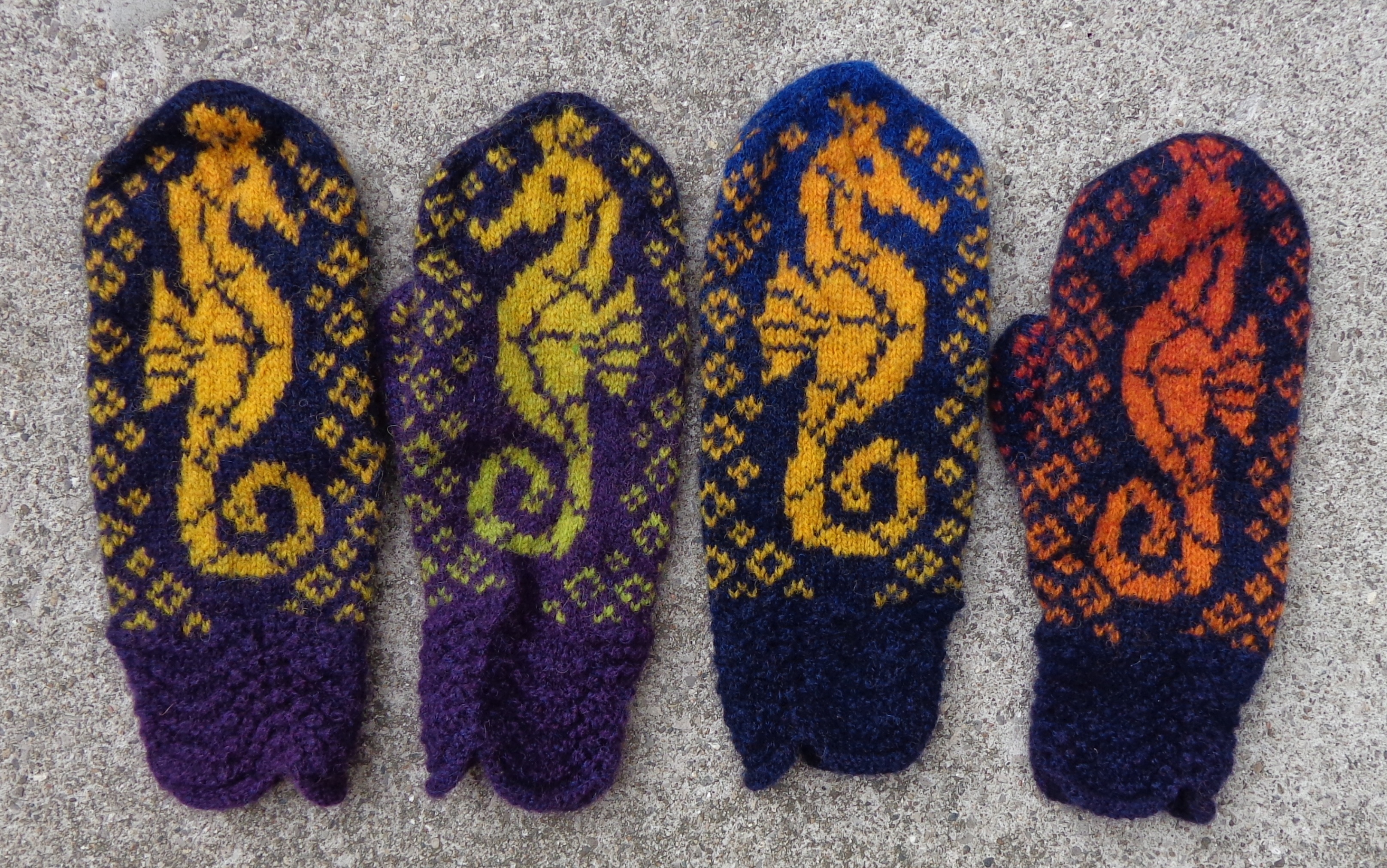 I haven’t shown you any knitting for a while, but I’m really proud of these so you get to see.Hippocamus Mittens by Tori Seierstad knit in Kauni Effektgarn by Deborah CookeThis pattern is called Hippocampus Mittens (here’s the Ravelry link). I’ve liked them for years and finally decided to knit a pair. I had some bits and ends of Kauni Effektgarn left over from knitting Mr. Math’s Elrond Sweater so I could shop the stash for this project. I have sweaters on the go, but sometimes a small project is exactly what you need.