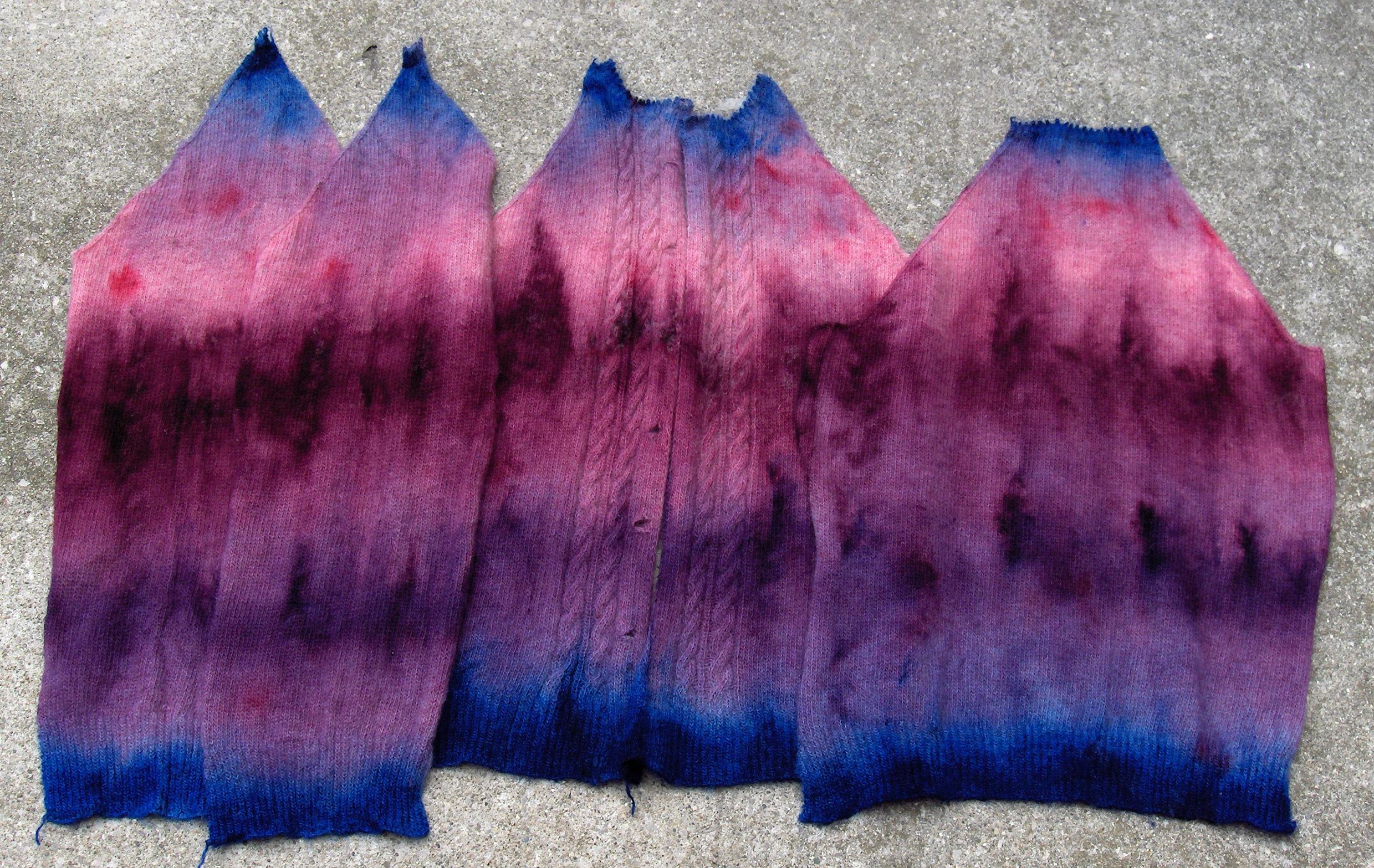 I used the acid dyes made by Jacquard, and steamed the pieces to set the colour. The sweater was pinkish, so I used Burgundy, Purple, a bit of Fire Red and some Sapphire Blue at the tops and hems. Note that there is less Sapphire Blue in the finished yarn, because there’s that bit of ribbing at the top that just got chucked. Here’s the result: