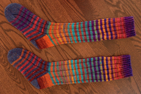This pair of socks are knit in Noro Sock yarn. Although this is a yarn from a big commercial mill, there’s a deliberate wabi-sabi attitude toward self-striping repeats in Noro yarns. Sometimes a color is missing from the sequence. Often the color segments are of different lengths. The repeat is less perfect and more organic, which I like a lot. These socks are knit from alternating balls – 2 rows from ball A, then 2 rows from ball B, then back to ball A for two more rows etc. This is one of my favorite ways to show off self-striping yarns.
