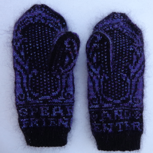 I’m going to line them, so they aren’t done. My first idea was to knit a Citron cuff to extend beyond the existing one, but they’re already so long that I’ve decided against that. I knit my Gates of Moria mittens with one strand of Rowan Kidsilk Haze and one strand of fingering yarn held together, which made them thick, soft and very warm. In this case, I’m going to knit a liner in just Kidsilk Haze – that will keep it thin, since these mitts are already a close fit. Even though I never carry a yarn more than a few stitches when knitting fair isle, that will also ensure that no threads are ever caught in pulling the mittens on.