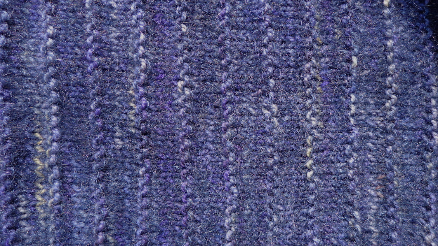 I started this project a year ago, in February 2022. (It was a free pattern then, but might not be so now.) I liked the design a lot but didn’t want to buy more yarn, so I shopped my stash. I came up with some Koigu KPPPM in a mixy blue and some Rowan Kidsilk Haze in Turkish Plum which matched. The resulting fabric is lovely and soft, with enough variation from the Koigu to make the colour interesting.