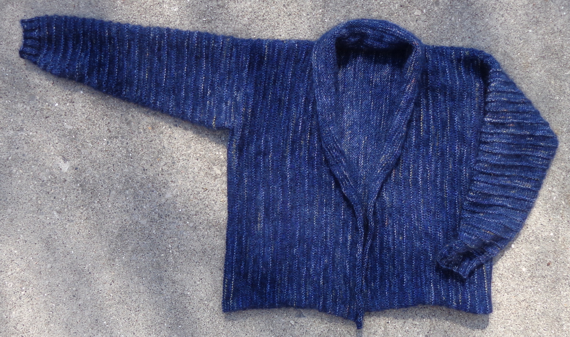 The construction is interesting. You can tell by the ridges that it’s a sideways knit. You cast on provisionally at what might be considered a sideseam, knit across the back, cast off stitches for the sleeve, then knit across one front. You put those stitches on a holder. You go back to the provisional cast-on to pick up enough stitches for the other front, then when it’s done, put them on a holder. You sew the shoulder seams, then start knitting those front stitches, up one side, pick up stitches across the back for the collar, then down the other front. This makes a self-rolling shawl collar after you knit five inches of it. Then you go back to each sleeve opening to pick up stitches and knit in the round, decreasing down to each cuff.
