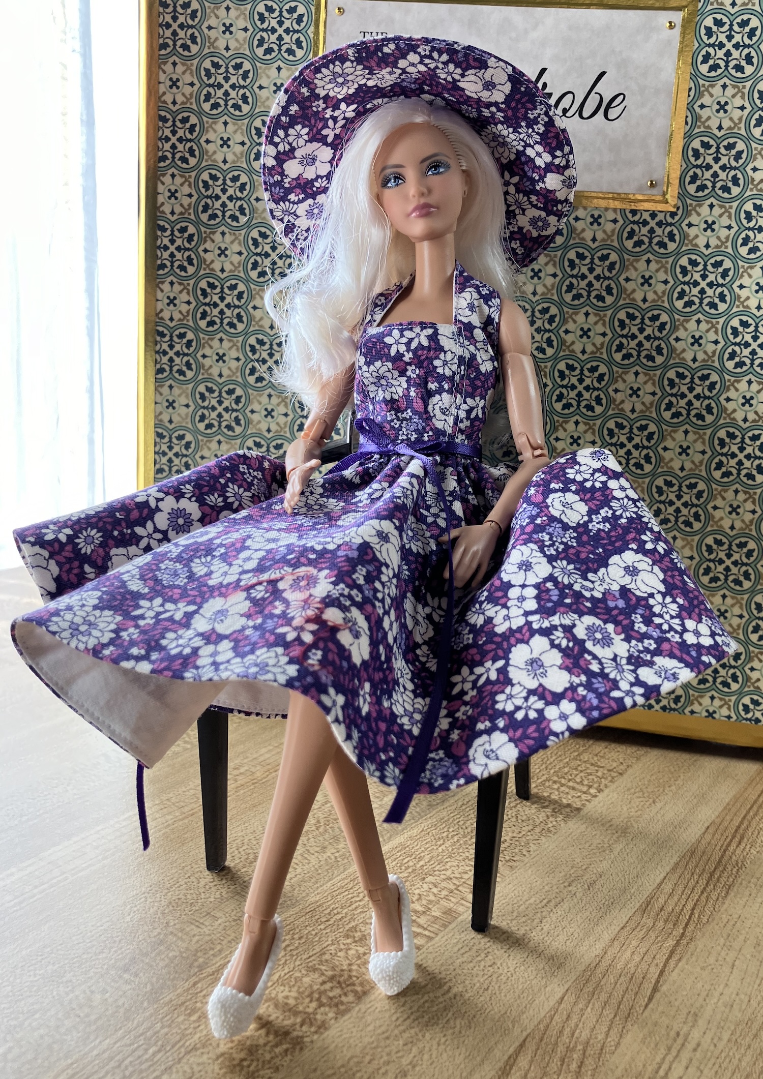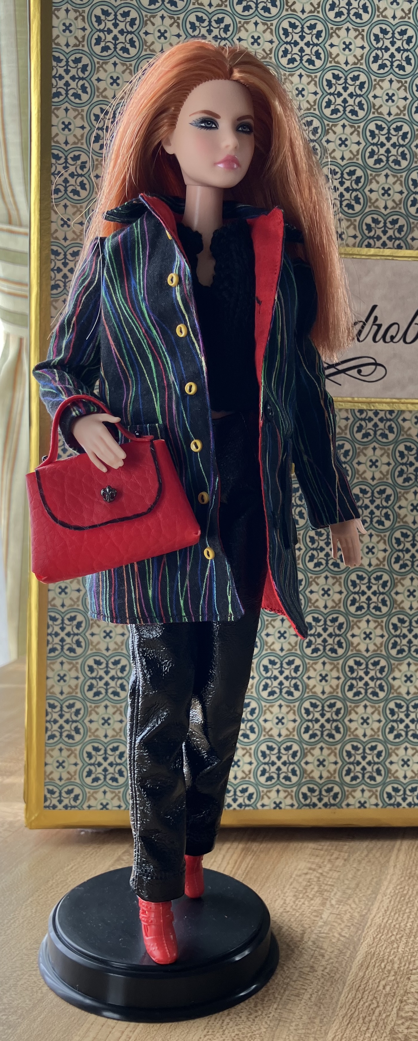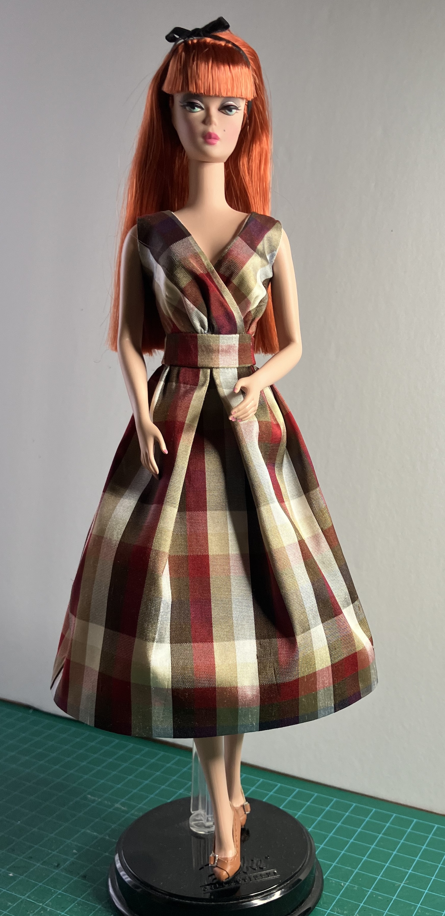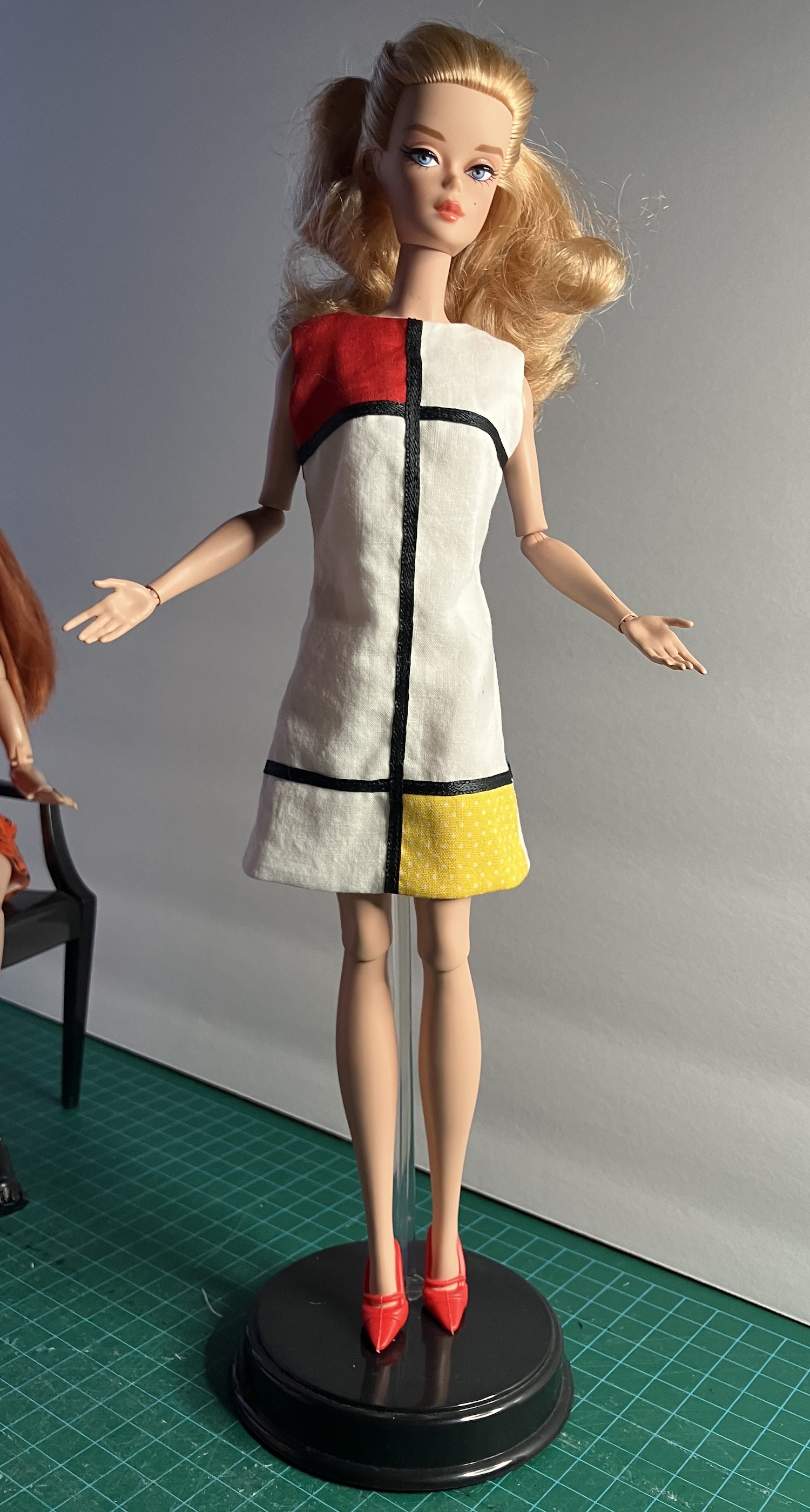I recently made my first APF pattern. It’s APF 82 – Easter Parade, a reproduction of a 1959 Barbie fashion from Mattel. It included a black unlined coat, a print sleeveless dress, a purse and a “hat” (which is kind of a hairband, made with a “garbage tie”. Hmm.) Here’s a description on the Barbie Wiki with a picture of the Mattel original. I got this pattern on Etsy somehow, probably in a bulk pattern purchase.